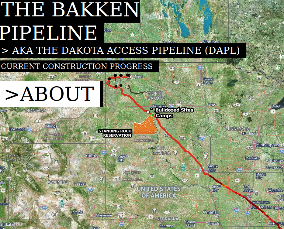 Allies: The owner of DAPL, Energy Transfer Partners (ETP) has been very opaque in their plans and permit applications. Though official construction maps of the exact location of the pipeline do exist, ETP requested that officials restrict public access to the data. But a resident of Ames Iowa, Nitin Gadia, took it upon himself to comb through hundreds of public record maps, and created a detailed map using the open source mapstory.org. The result is the Bakken Pipeline Interactive Map. Ongoing updates can be found at his site – Nitin Gadia: Mapping the Bakken (aka Dakota Access) Pipeline. Another Water Protector, Yvonne Scott, has publicized this map through her blog – Healing the Heartland, as she travels the entire route from Illinois to the Bakken region where the petroleum will be fracked. ___________________________________________________