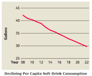 Coca Cola, and indeed all of the soft drink industry, has experienced a loss of market share in the last decade, mostly to bottled water. Sales of soft drinks has fallen every year since 2006. Derek Thompson of The Atlantic explained that the three soft drink “jobs” are now satisfied by other beverages. Growing numbers of people get their hydration from water, their energy jolt from coffee and energy drinks, and their fizzy fun from flavored seltzers, like LaCroix. Since 2000, bottled-water consumption has tripled – Diet Coke’s Moment of Panic. While the switch from sugary soda pop to water is a welcomed health improvement, the continued and growing use of single-use plastic bottles in no improvement at all.