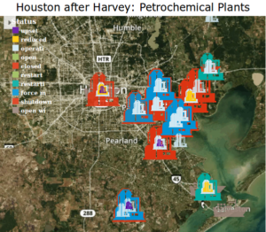 There are quite a number of media stories about these various environmental disasters, but one of the more revealing views comes from the industry itself. A commercial group called Independent Chemical Information Service is the world’s largest petrochemical market information provider of pricing information, news, analysis and consulting to buyers, sellers and analysts. They examine in real time the status of supply and demand within 180 commodity markets, and their website has an interactive map to search for information on given products or companies. This map is very busy at the moment, with status reports on every business affected by Hurricane Harvey – Hurricane Harvey impact on the petrochemical markets (interactive map). You can view the entire Gulf Coast, zoom to a regional level, or to a city, or even down to neighborhood scale. Hover over the icon for a company, and see it’s status from a list including: shut down, reduced, restarting, operating, etc., and some disturbing categories such as “upset”, “closed”, and “force majeure”. “Force majeure” is a legal term, referring to a company’s inability to produce a product or service following a storm or other unanticipated event.