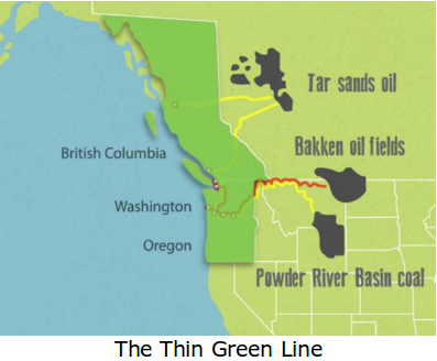 The Thin Green Line – an enigmatic, yet intuitively charged, descriptor of the ecological organizations in the Pacific Northwest that are engaged in near heroic struggles against fossil fuels. The involved activists consist of environmental groups, Native tribes, think tanks, community empowerment groups, public interest law firms, and others. They aren’t necessarily working as a unit, though their causes overlap, and they often collaborate on large issues. But collectively they are The Thin Green Line, and have a cumulative impact blocking tar sands oil, fracked shale oil, natural gas, and coal from reaching export terminals on the Pacific coast. Two of the key players are the Sightline Institute that ties issues and groups together with research and news, and the Columbia Riverkeeper that acts on many levels of river protection, legislative efforts, and regulatory challenges. The Sightline Institute maintains the website of The Thin Green Line.